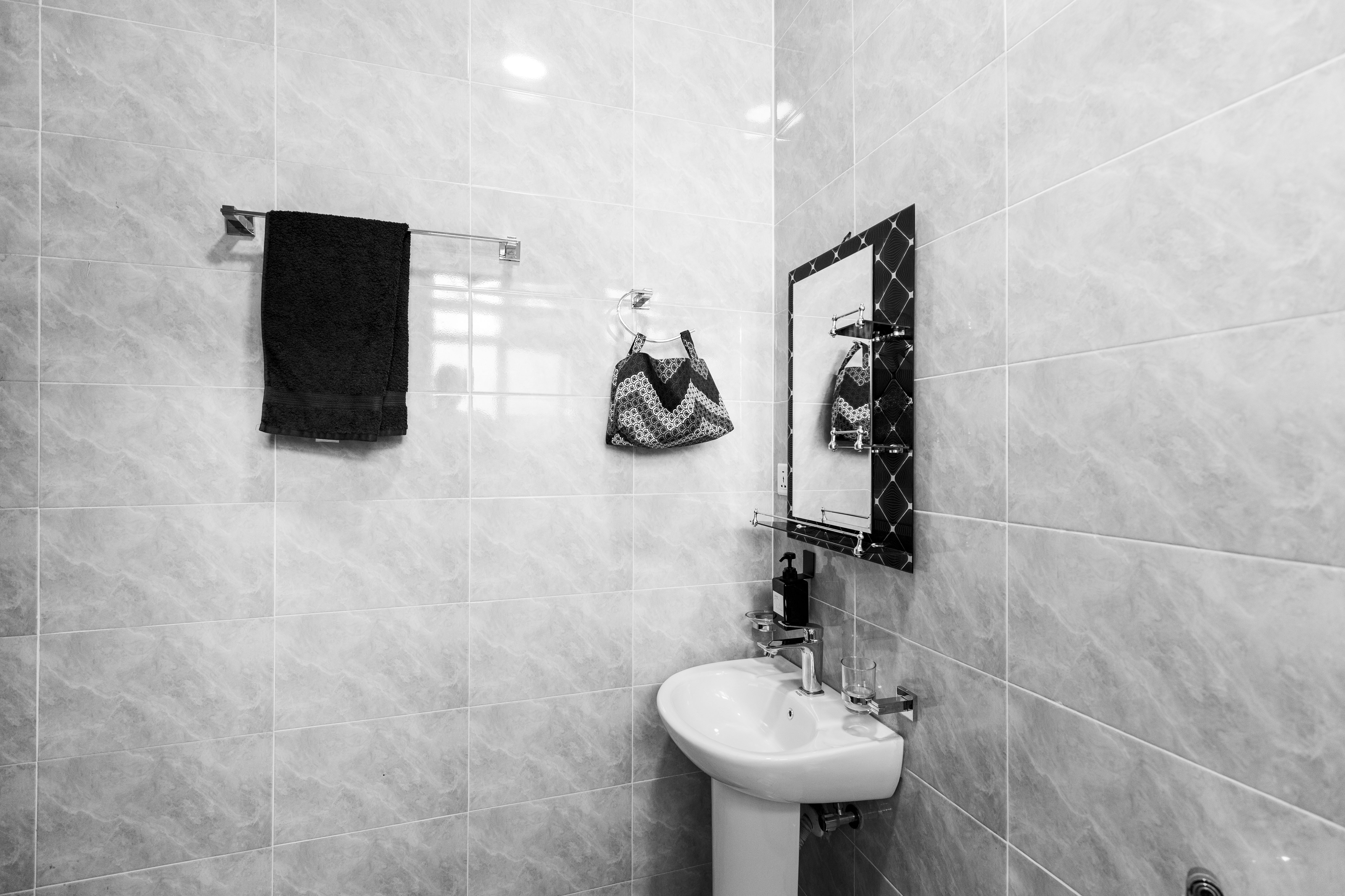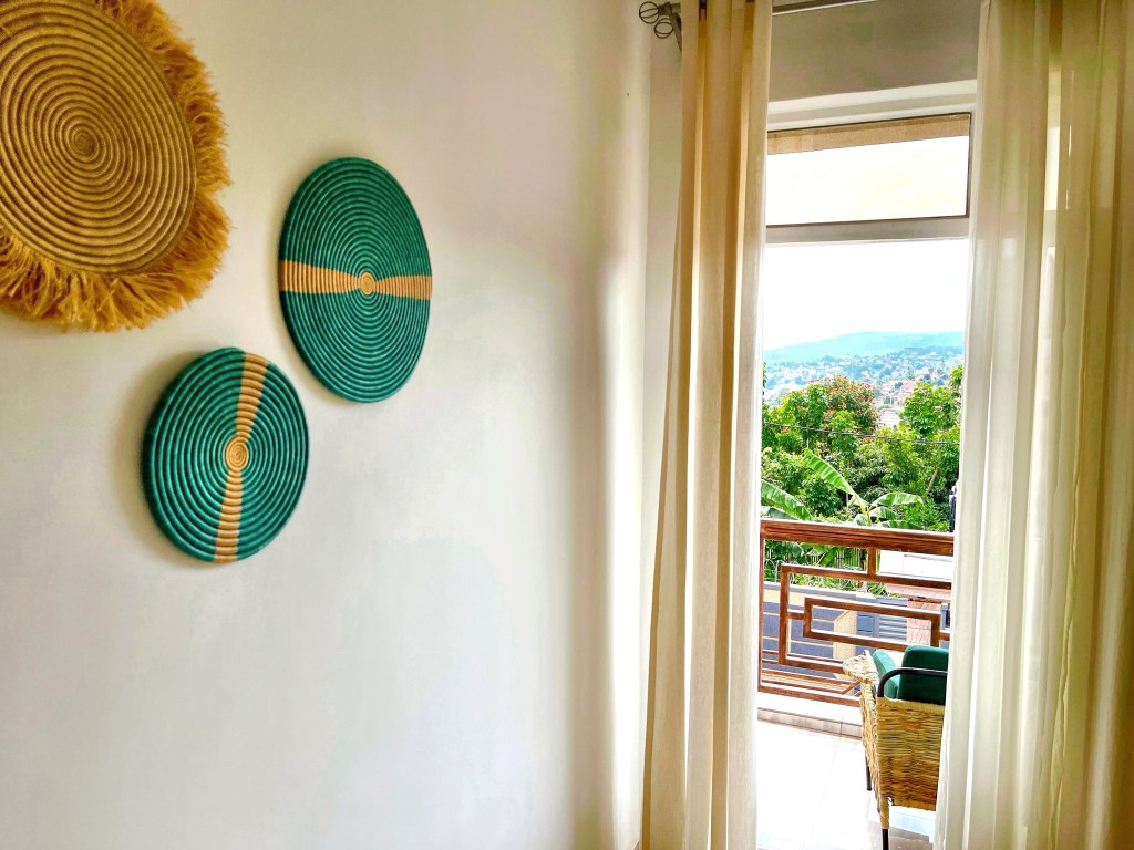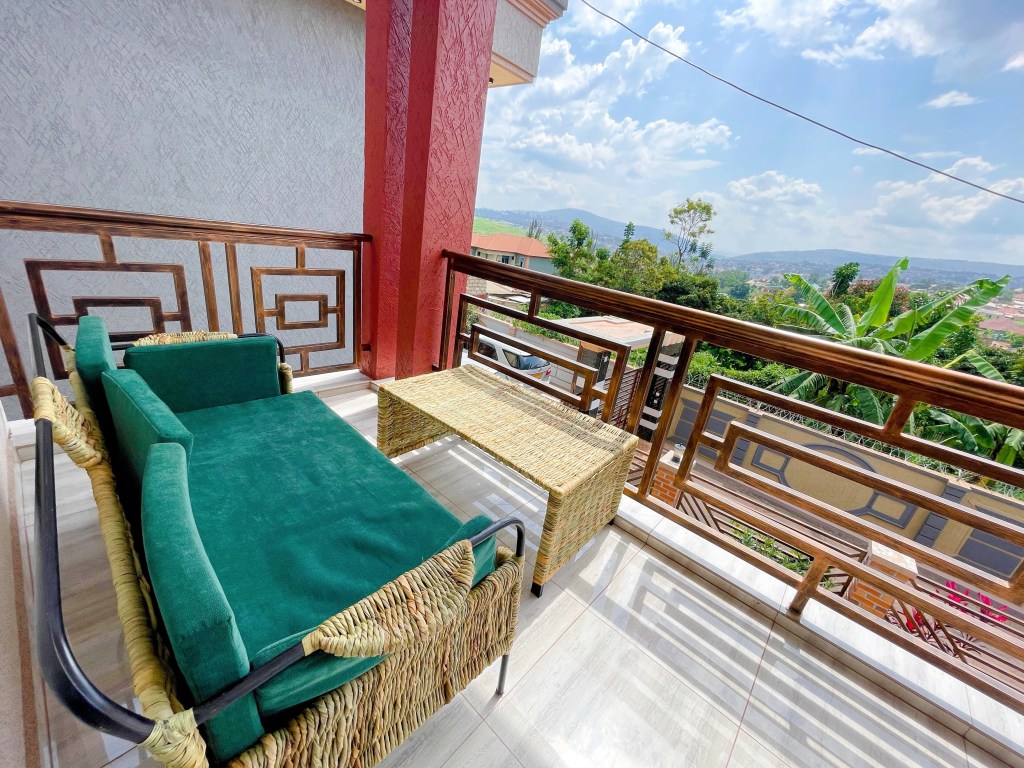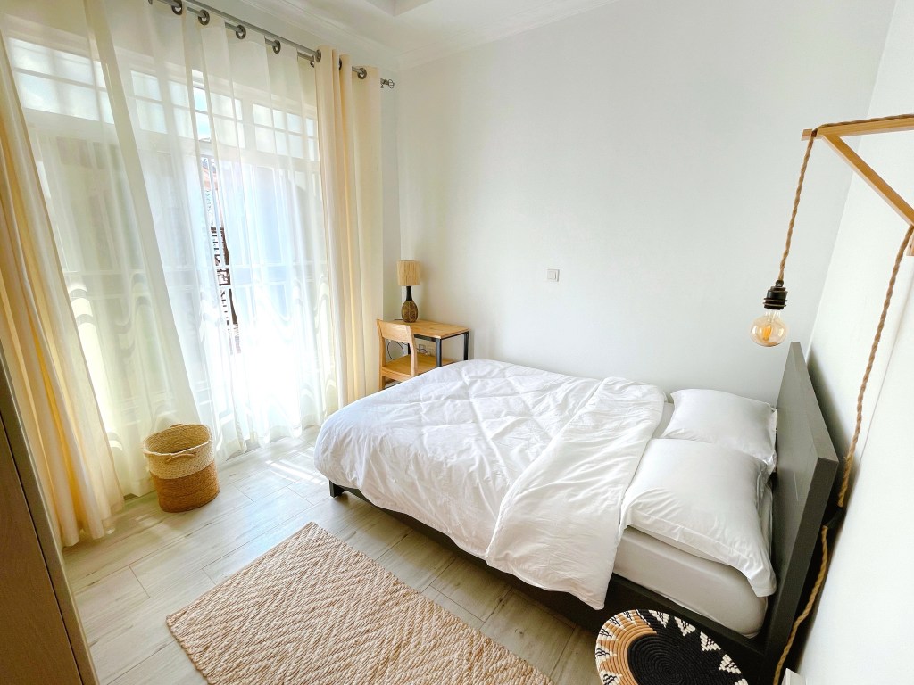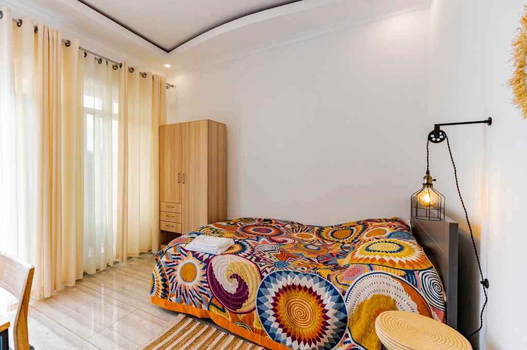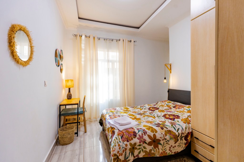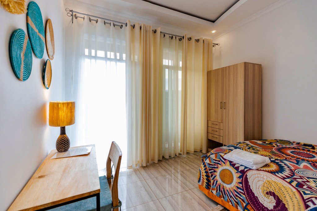 Fully furnished room with cupboard, table, chair, bed size 1,40 x 2,00, shared bathroom with Room 4, own balcony with view of Downtown, first floor